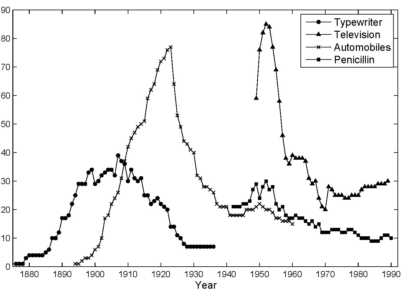 A phenomenon which, in my view, is very interesting to observe are shakeouts. The first phase of a new industry is usually characterized by lots of firms entering. Everybody wants to have a piece of the cake. But, although overall output in the industry is increasing, after some time, the initial number of firms in the market isn’t sustainable anymore. The industry enters a period of consolidation, which can be very extreme. Figure 1 in our paper gives some examples for shakeouts in the U.S. history.