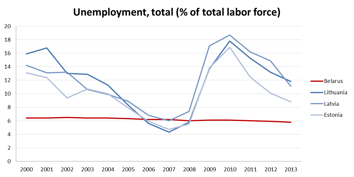 To have another benchmark, putting Lithuania’s economic development into perspective, I will look at data from Belarus, Lithuania’s south-eastern neighbor. The Baltic states as well as Belarus were both part of the Soviet Union until 1991*. Since then, however, Minsk took a quite different route and remained much more oriented towards Moscow, economically as well as politically.
