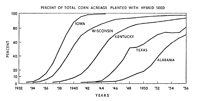 Looking at the adoption rates of hybrid corn (a technology which began to diffuse in the 1930s), Griliches provides a classical case study of the pace of and the economic conditions that influence technology adoption. In the Figure you can see the data Griliches used. It took considerable time until US farmers started to grow hybrid corn on their fields. You can also eyeball a clear correlation of adoption speed and geography. A subsequent formal analysis confirms this observation and explains it by economic factors that vary across regions.